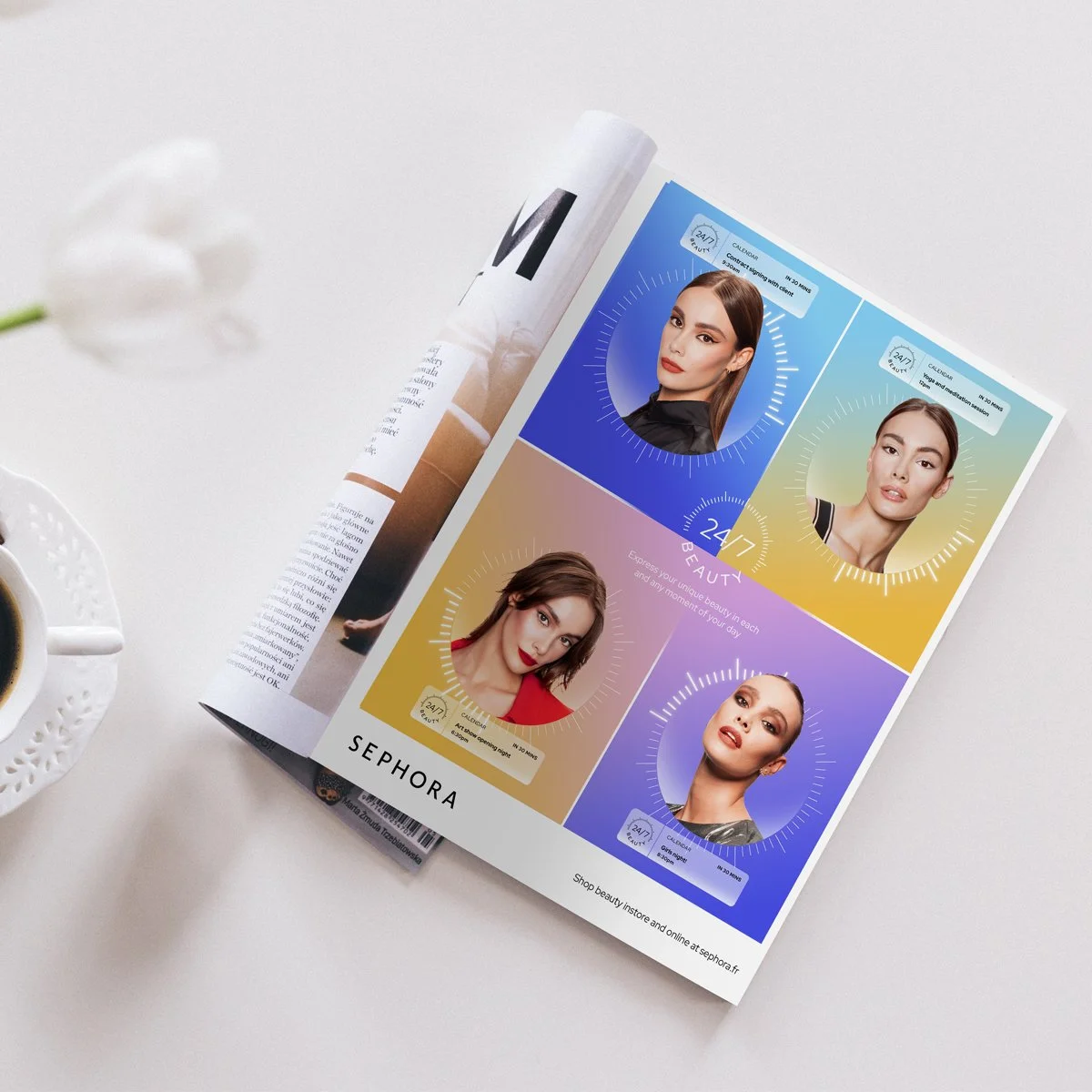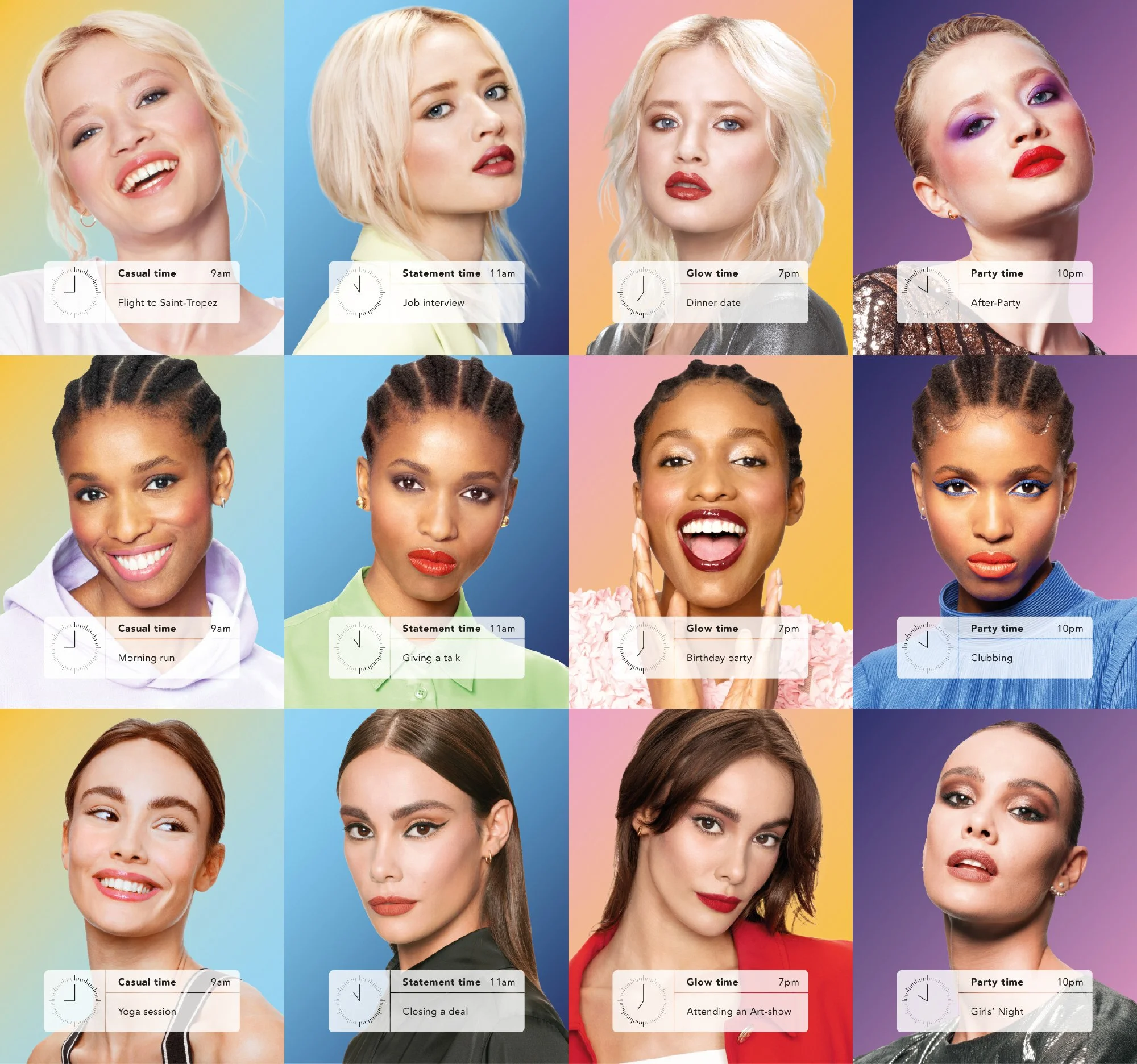 The campaign centres around 24-hour beauty, following three beauty stars and their evolving, individual looks throughout the day and night. The concept was brought to life through simple but striking day-to-night gradients, and fun and characterful art direction, allowing the personalities of the stars to shine.