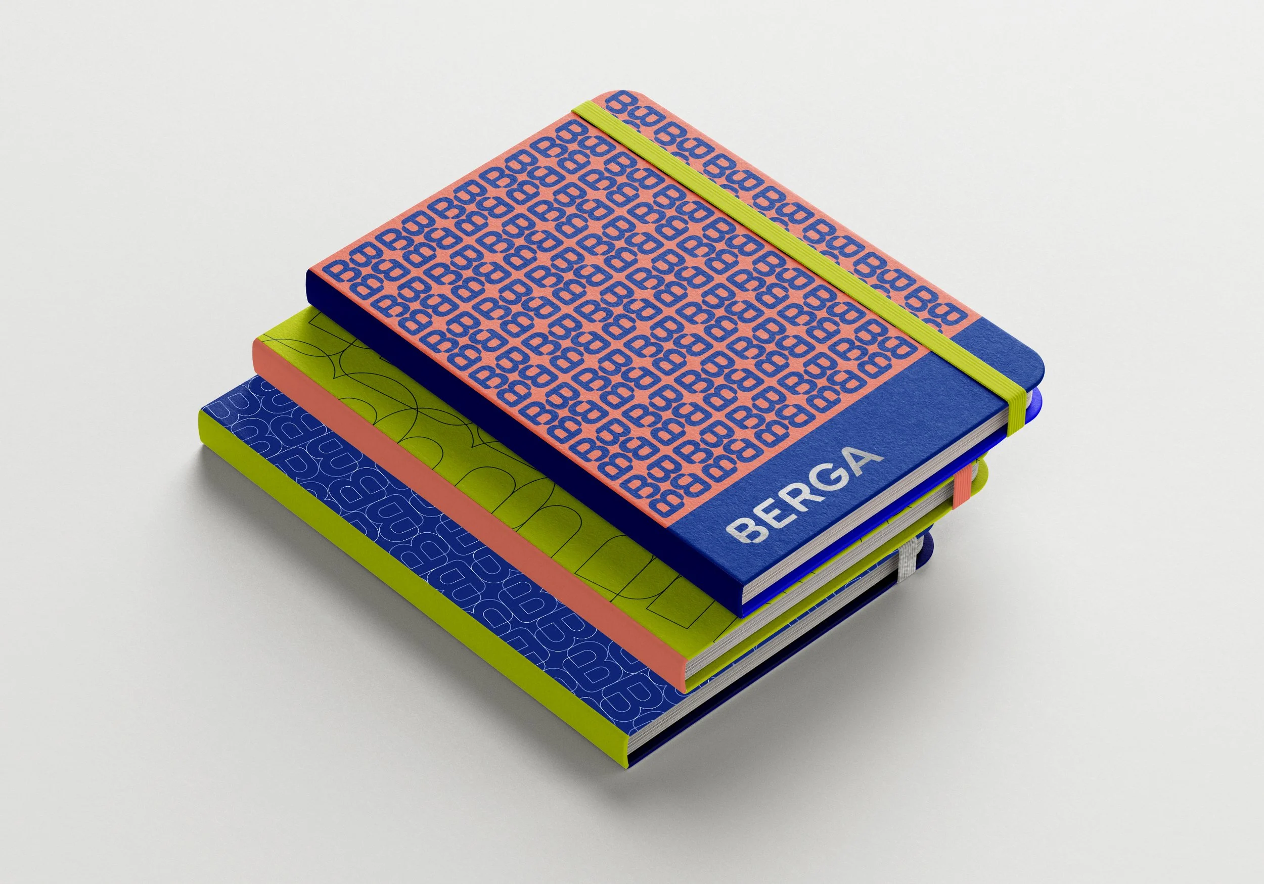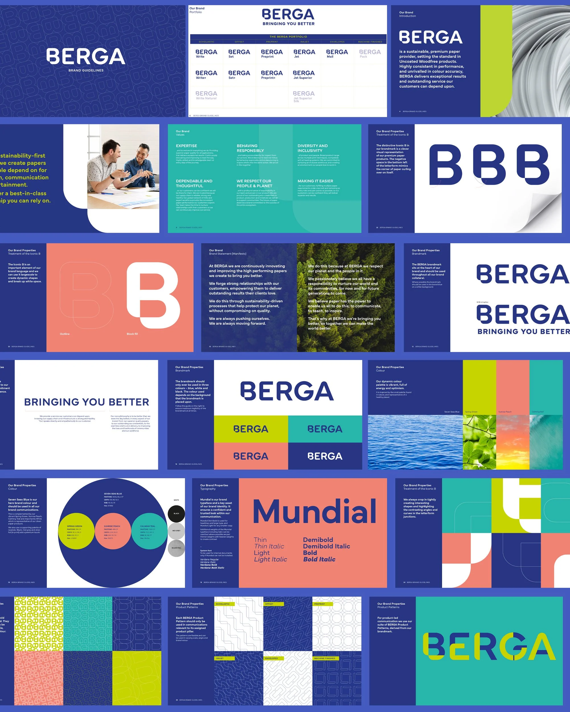 The distinctive B in the brandmark is a clever representation of Berga’s premium paper products. The negative space in the bottom left of the letterform mimics the corner of paper curling over on itself.