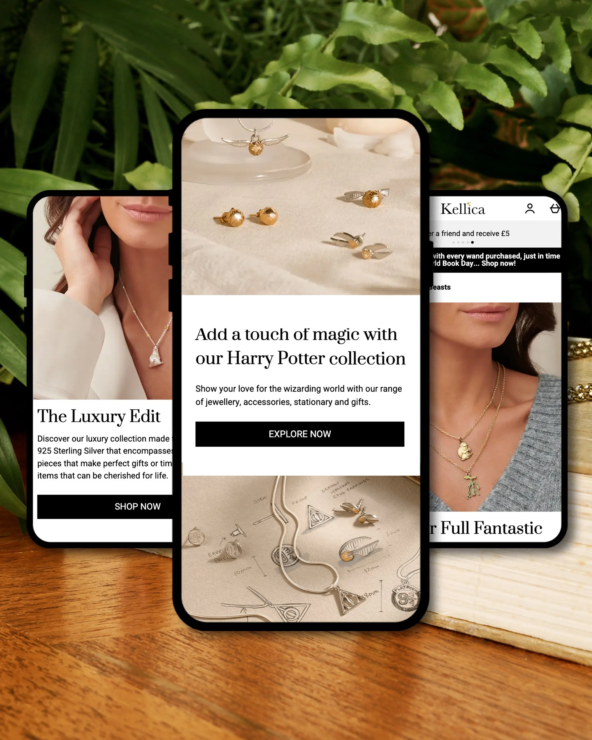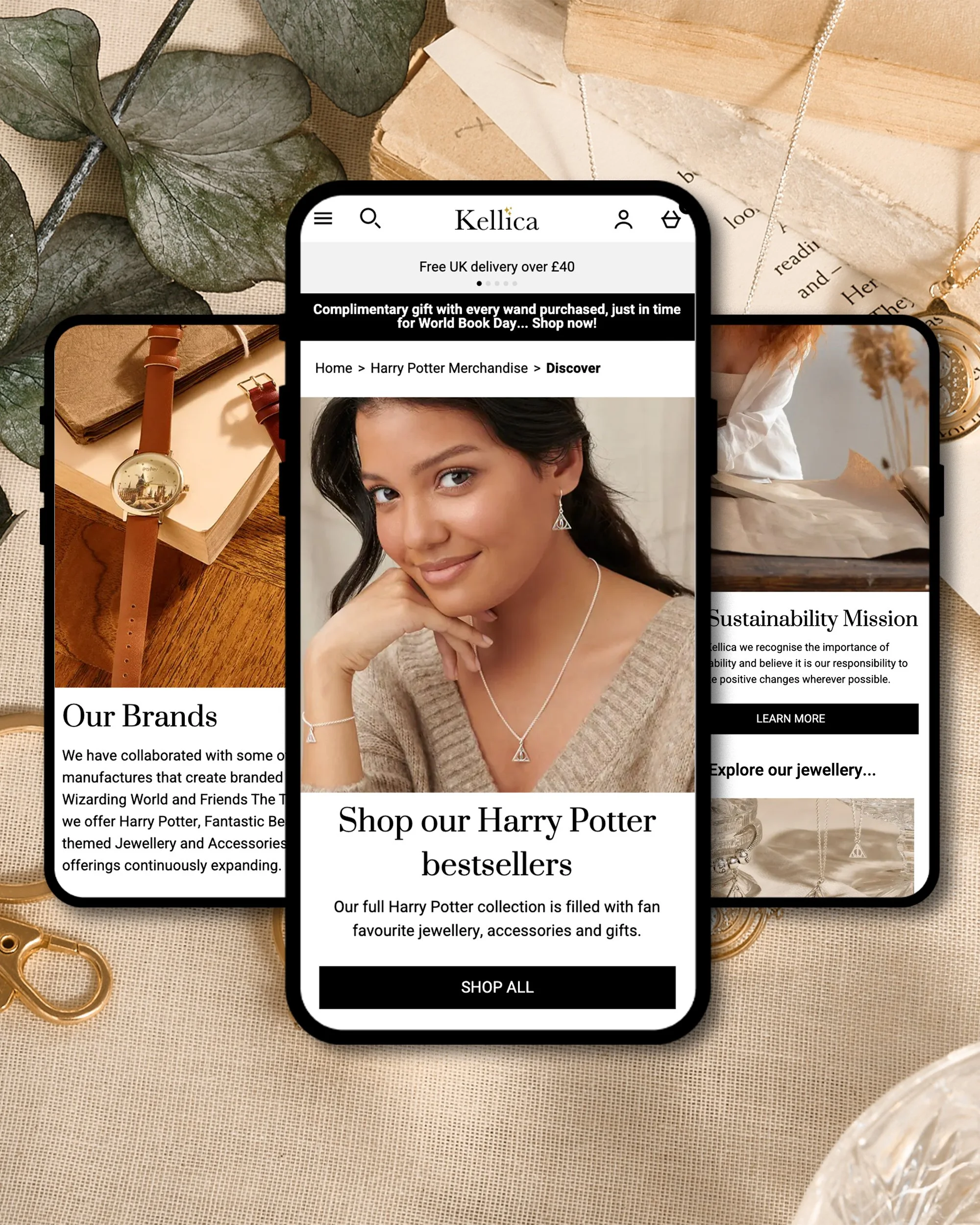 The DTC for movie-inspired fan-favourite jewellery brand Kellica was not performing. The style guide was clunky, the customer journey was very perfunctory. With a conservative budget I was tasked with improving the UX and overall look and feel to better engage with the consumer. This involved redesigning the style guide, sitemap and wireframes. In tandem I art directed a considered photoshoot of model and still life imagery that more accurately aligned with the highly knowledgable target audience.