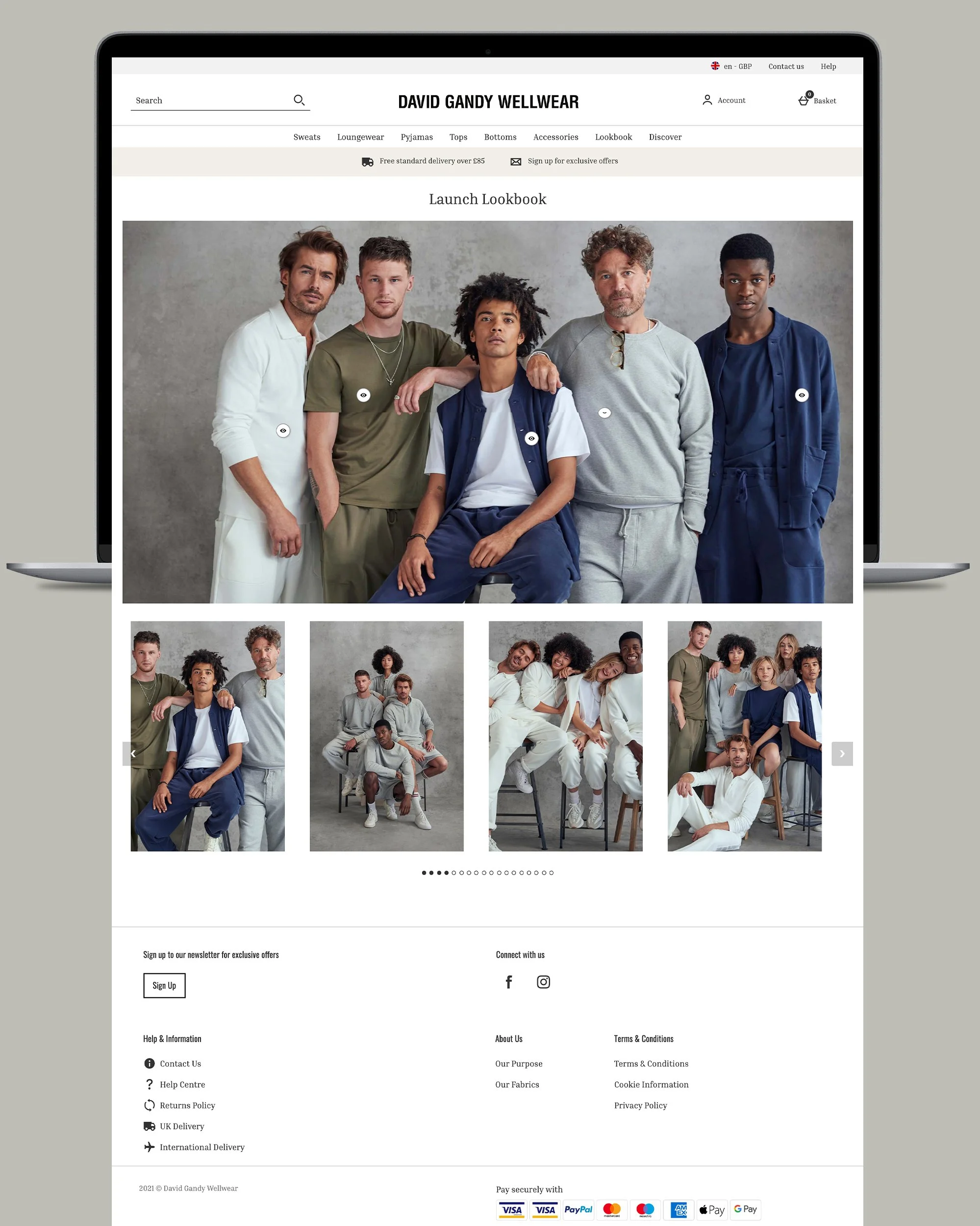 DTC website design for the highly anticipated David Gandy Wellwear brand. The client required a clean and sophisticated design with large visuals. In keeping with the brand’s wellbeing proposition it was key the user experience was straightforward and rewarding. Bespoke ‘Get the Look’ widgets were developed to bring an editorial and interactive feel.